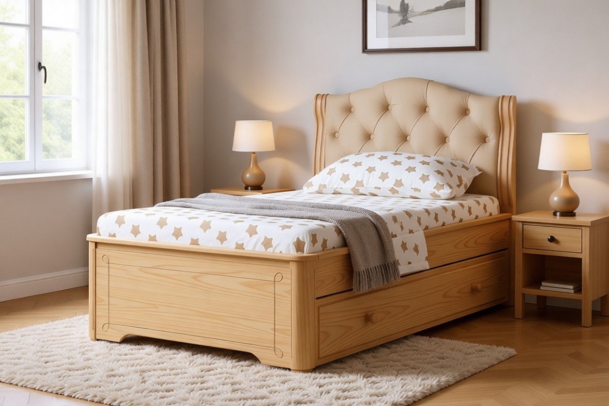 Ящик: корпус - массив сосны, дно - ДВП белого цвета. На колёсиках, к кровати не крепится.