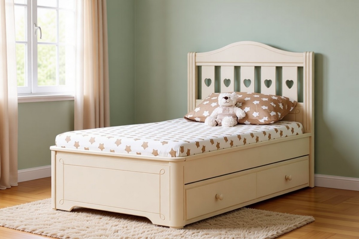 Ящик: корпус - массив сосны, дно - ДВП белого цвета. На колёсиках, к кровати не крепится.