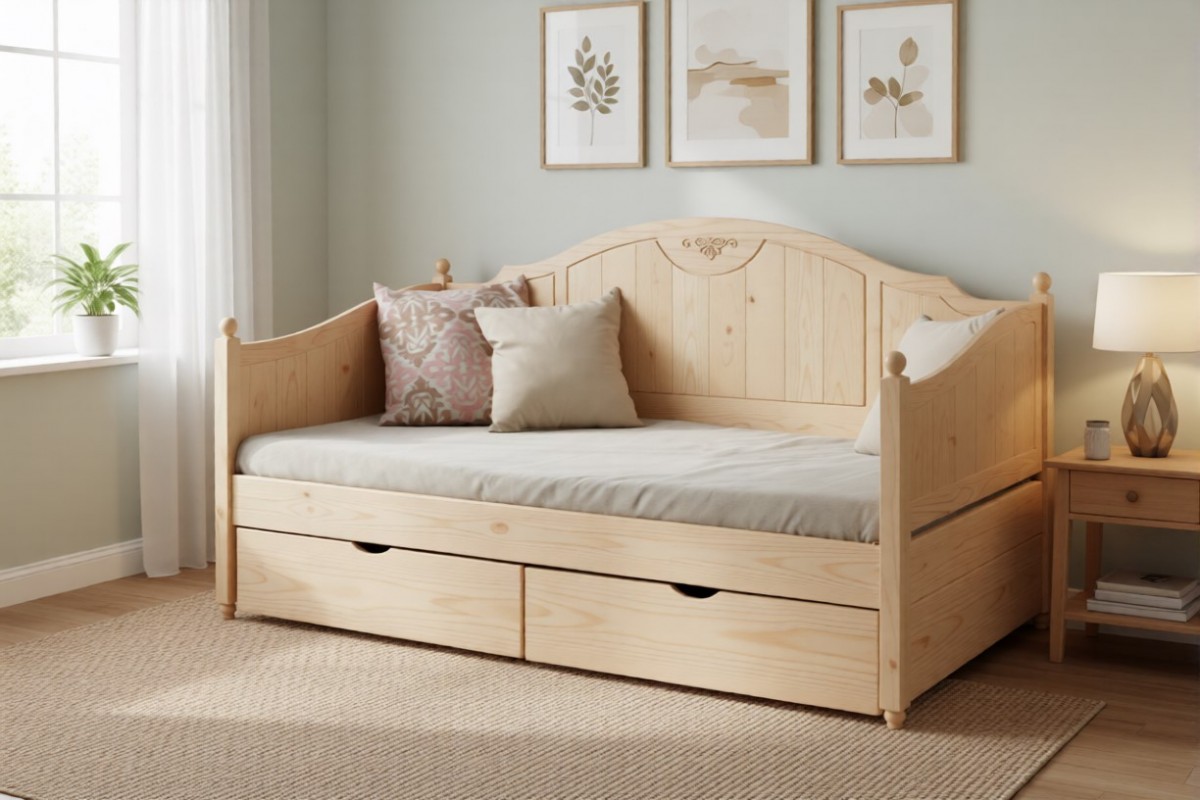 Материал изготовления: массив сосны. Основание под матрас: деревянный реечный настил. Дно у ящиков: ДВП белого цвета. Ящики выкатные, на колёсиках.