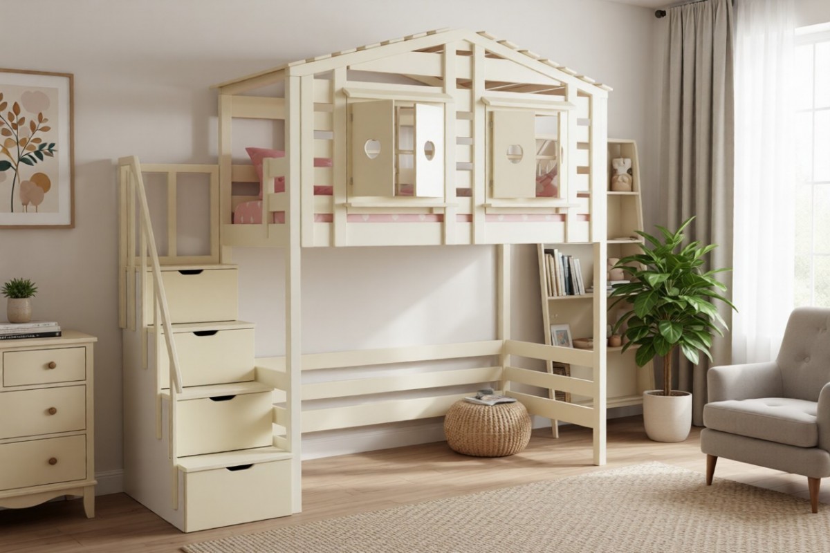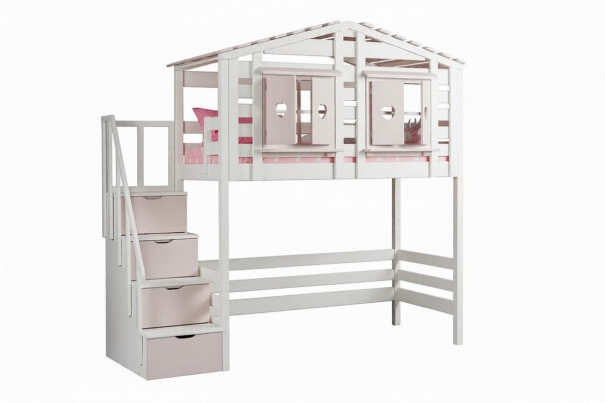 Верхнеярусная кровать-домик (кровать-чердак) Тимберика Кидс №13 с лестницей в виде комода (ТК №13)