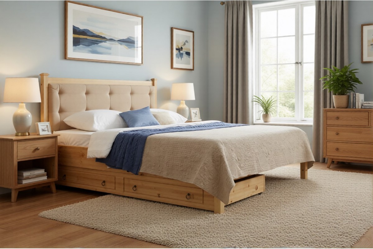 Двуспальная кровать Дания №1 с мягким изголовьем и двумя малыми ящиками.