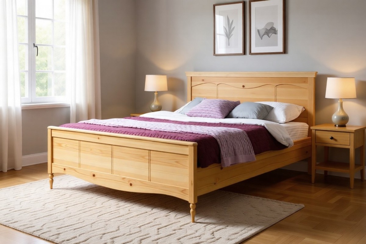 Материал изготовления: массив сосны. Вставки на спинках: фанера (берёза). Основание под матрас: деревянный реечный настил.