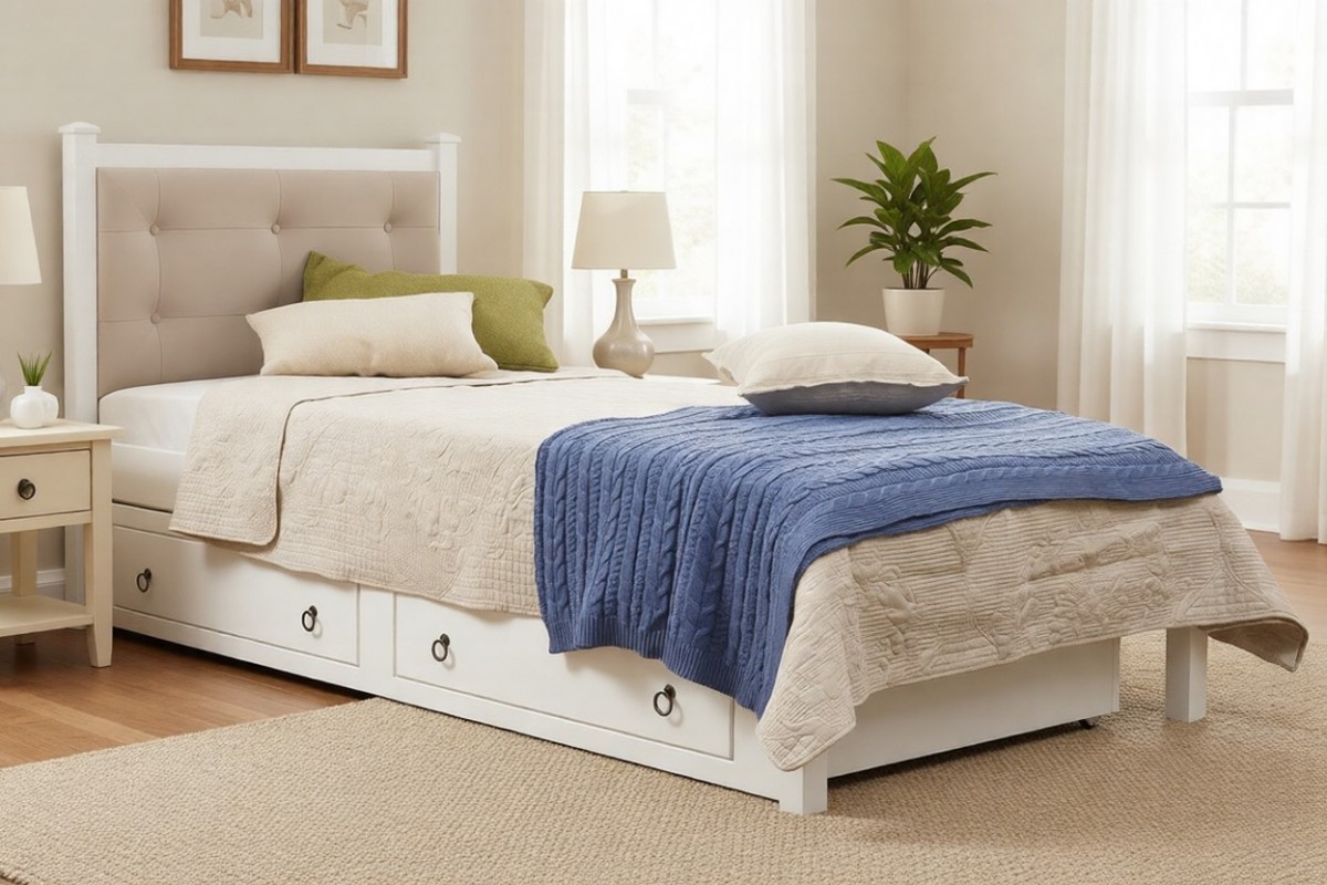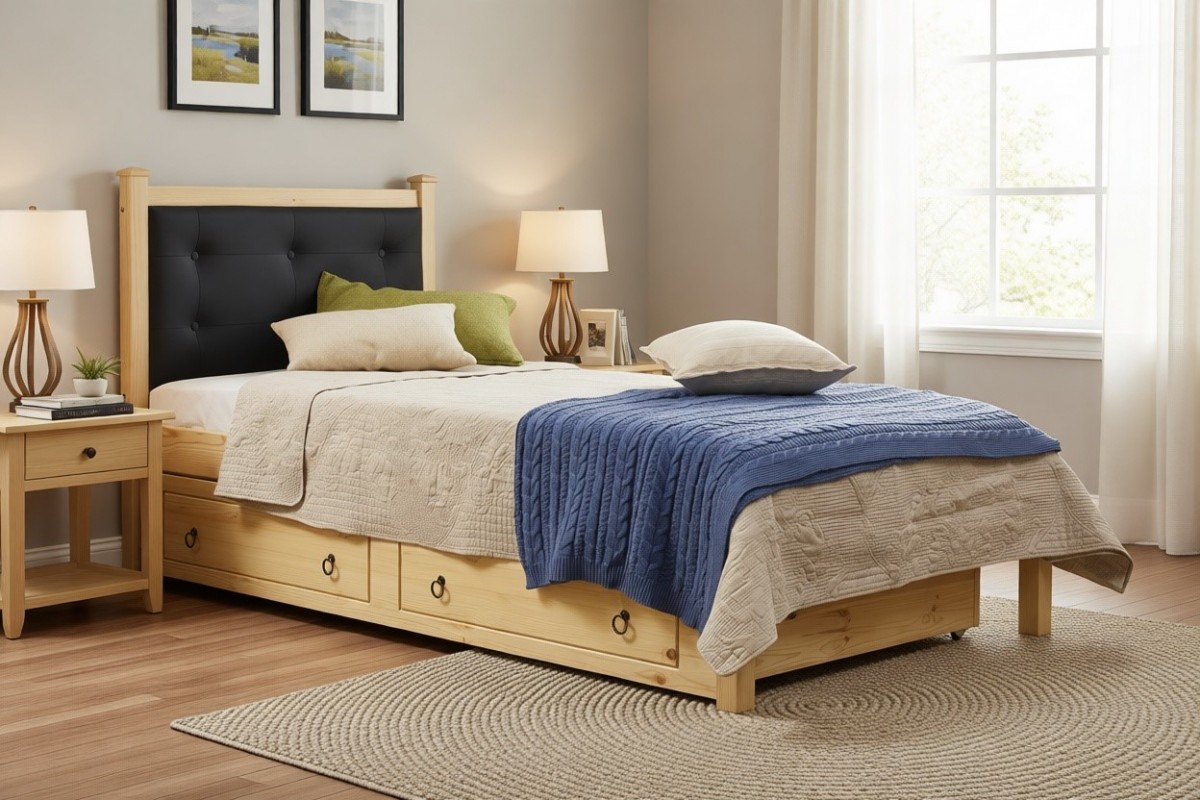 Односпальная кровать Дания №1/1 с мягким изголовьем и двумя ящиками.