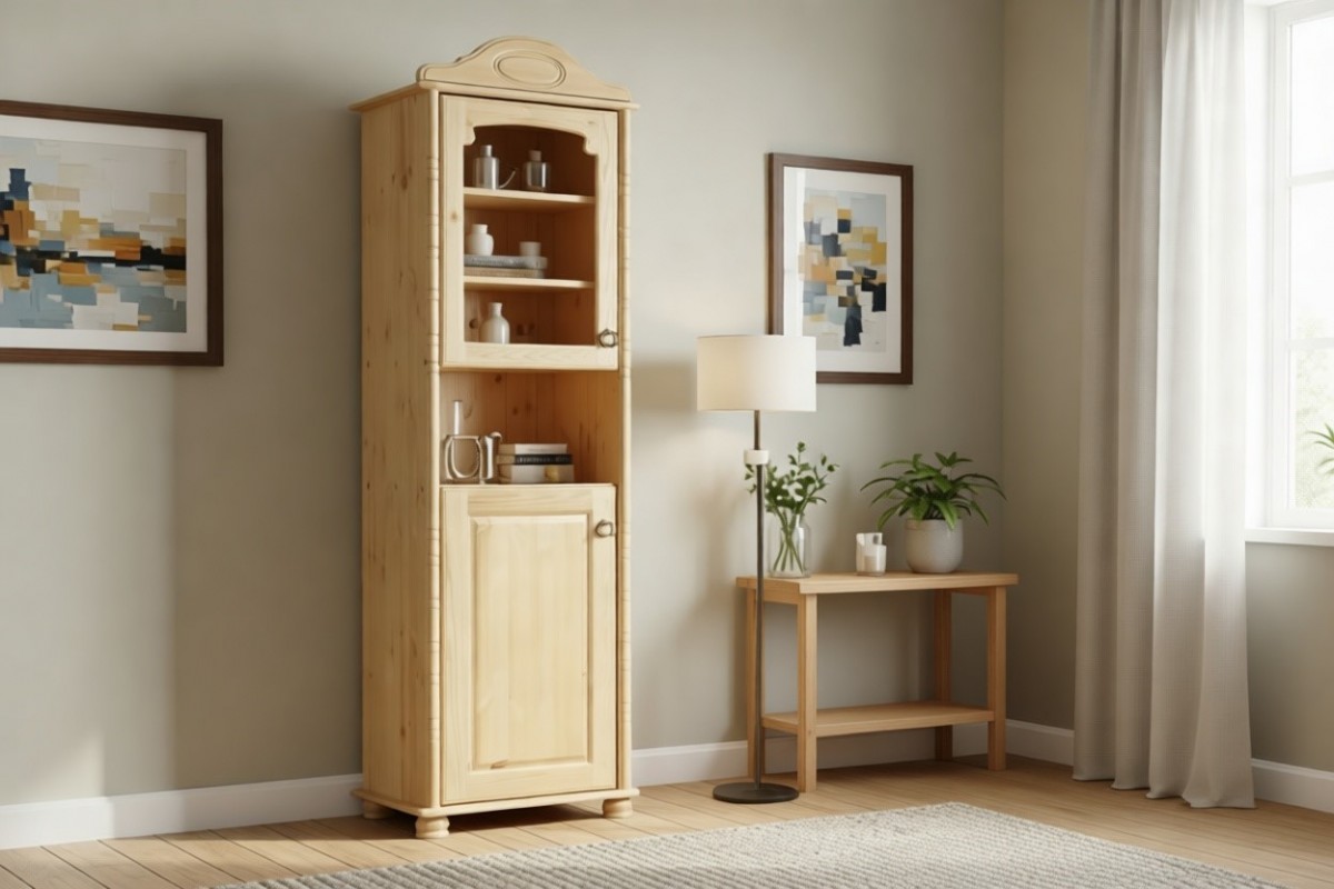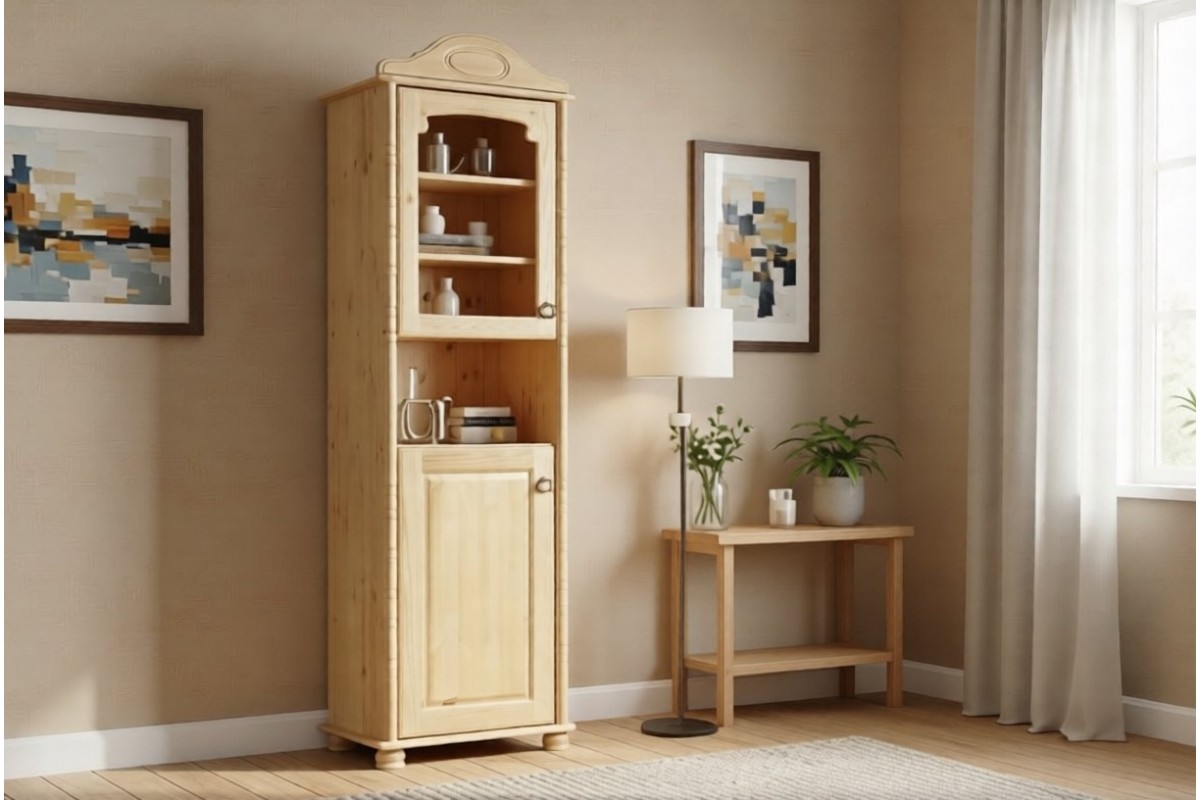 Наполнение: Открытая секция (за стеклянной дверцей) - три полки из массива. В нижней секции (за сплошной дверью) одна деревянная полка.