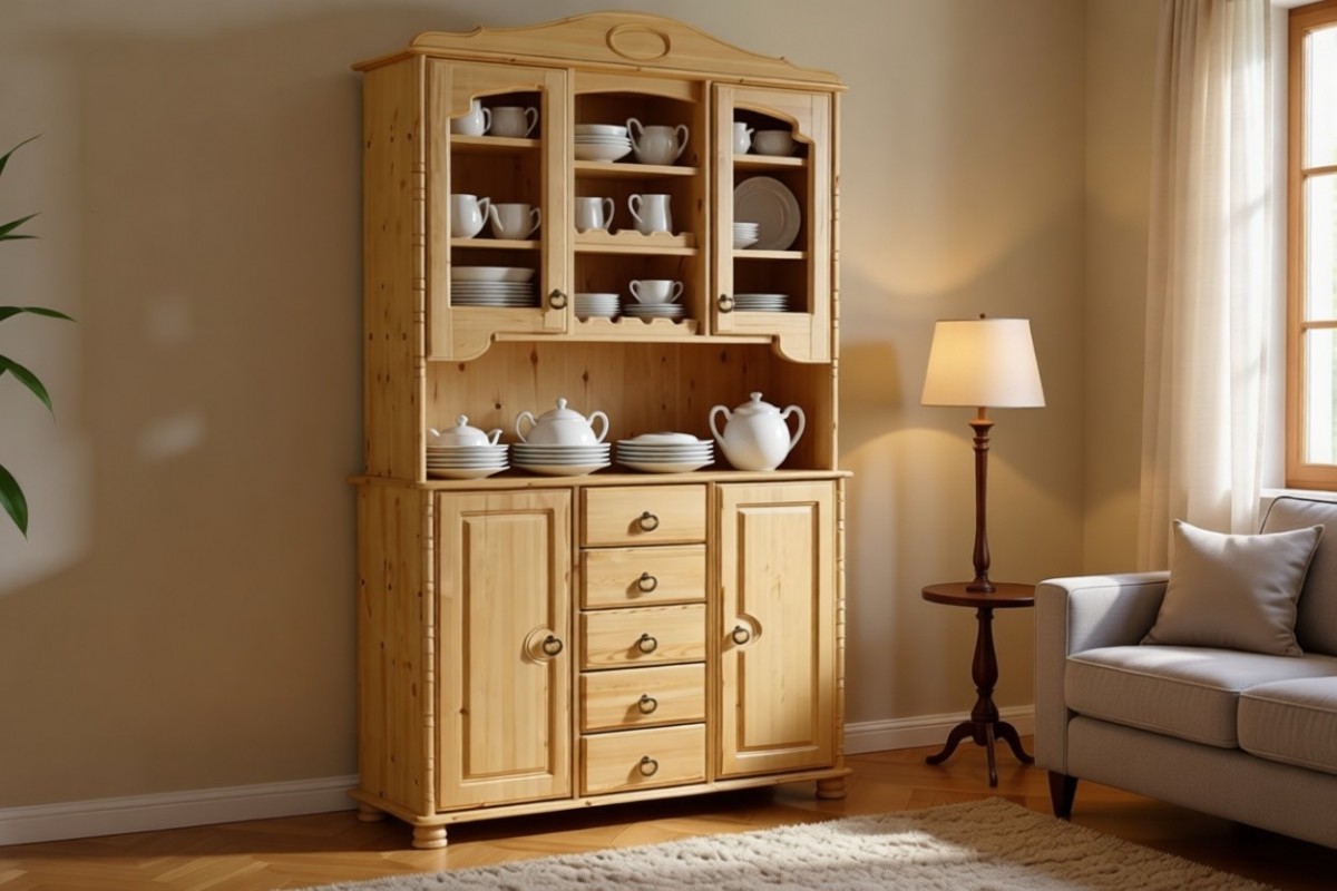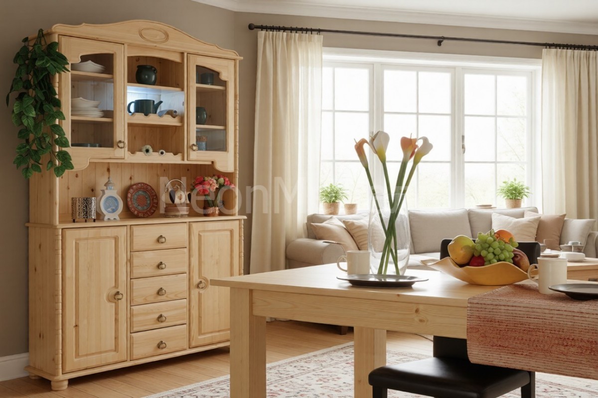 Материал изготовления: массив сосны. Задняя стенка: В верхней (открытой) секции - вагонка. В нижней (закрытой) секции - ДВП белого цвета.
