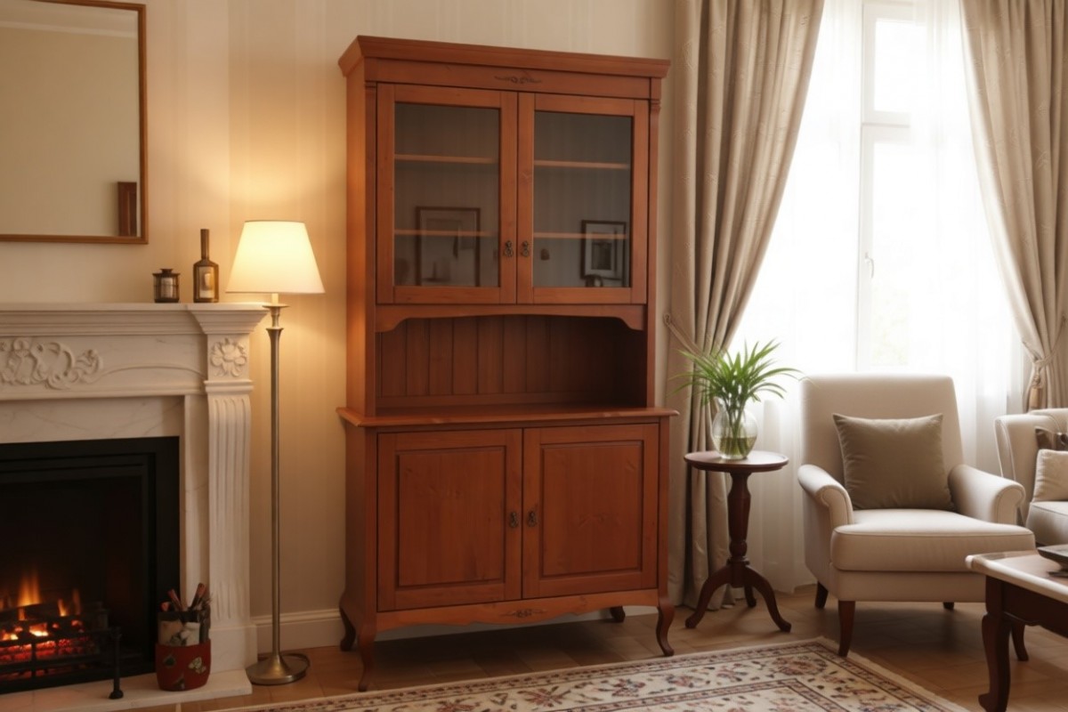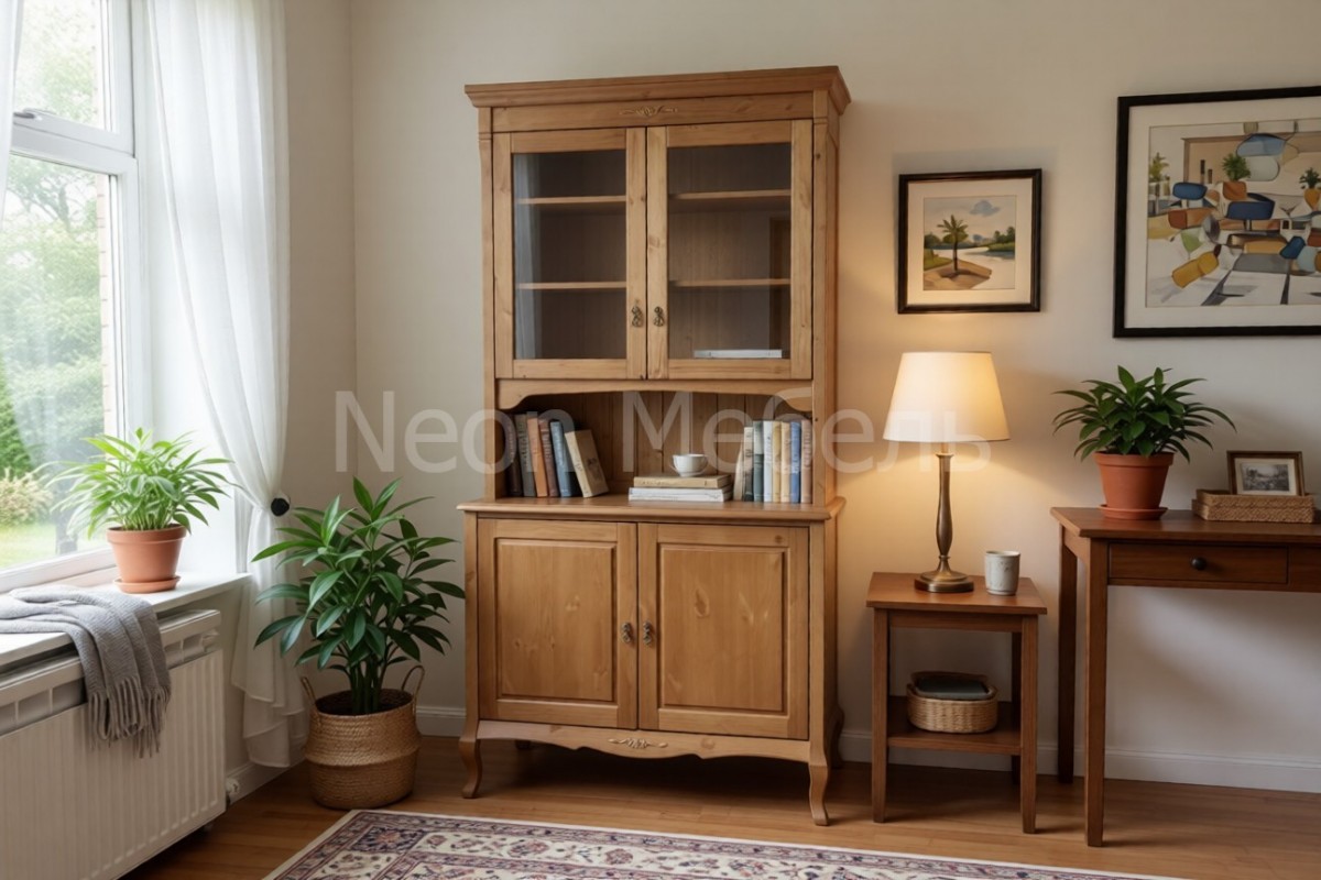 Наполнение: Верхняя секция с тремя полками, нижний закрытый комод с одной полкой. Задняя стенка у комода и у полок за стеклянными дверцами - ДВП белого цвета, по желанию можно укомплектовать фанерой в цвет изделия.