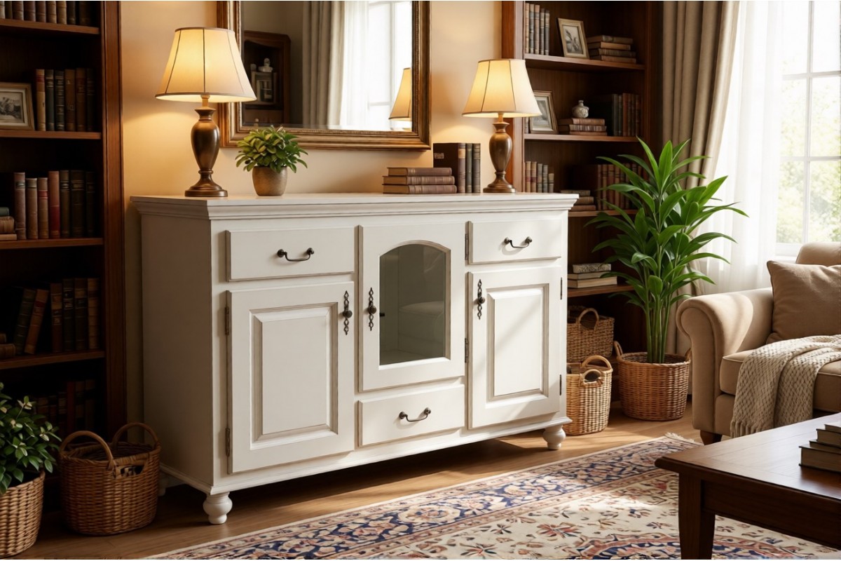 Наполнение: три выдвижных ящика и три закрытых отделения с полками.