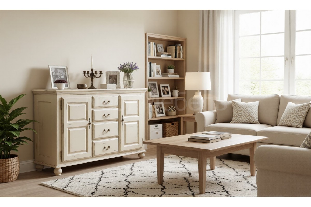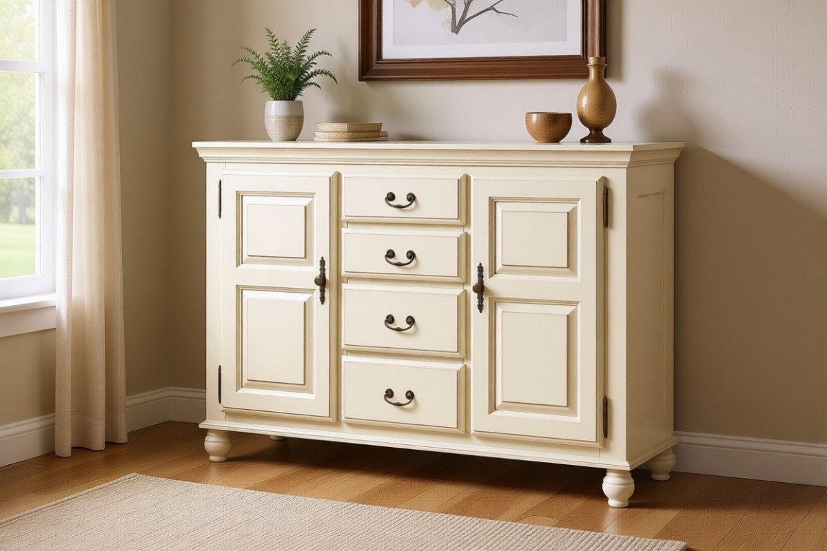 Наполнение: четыре выдвижных ящика и два закрытых отделения с полками.