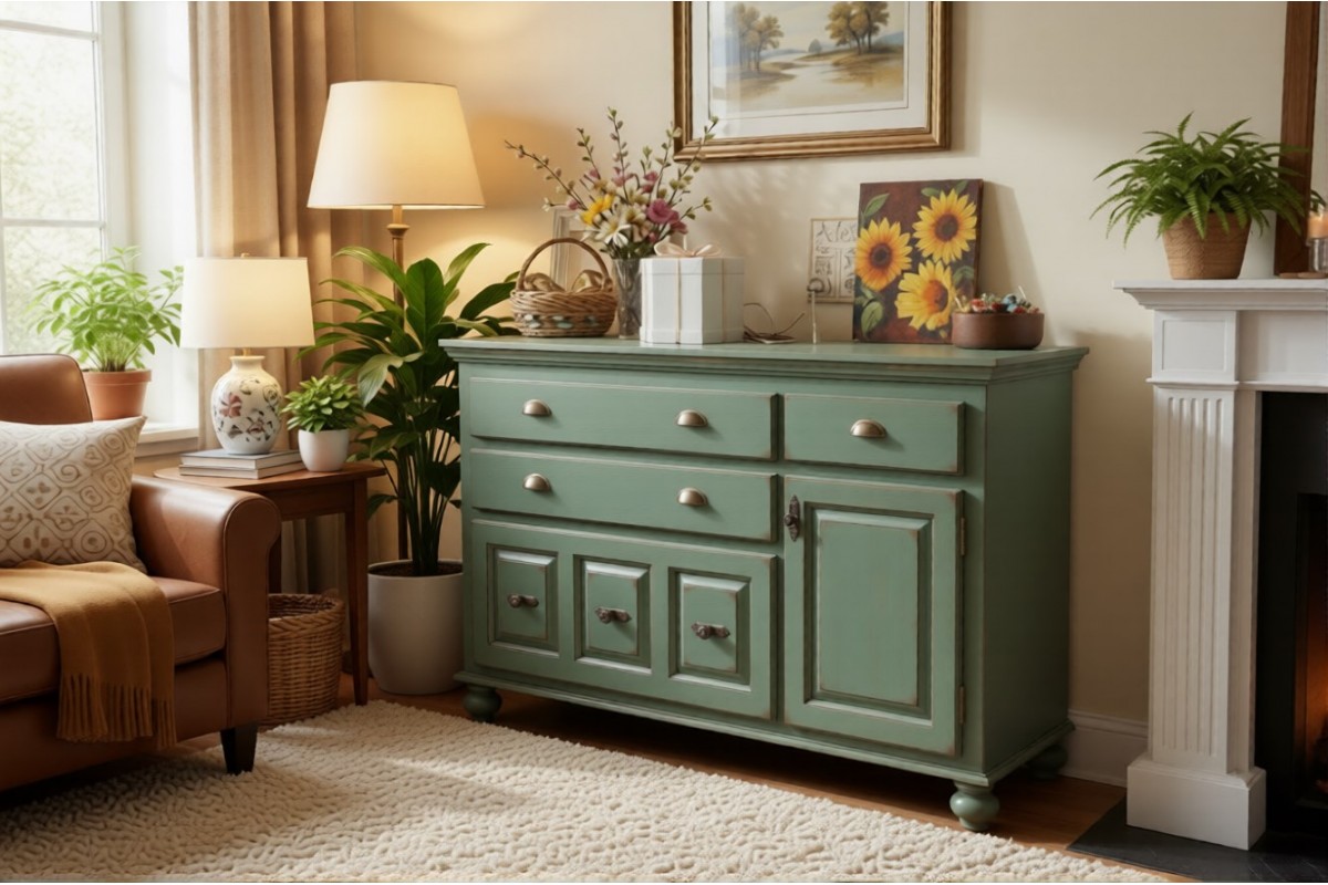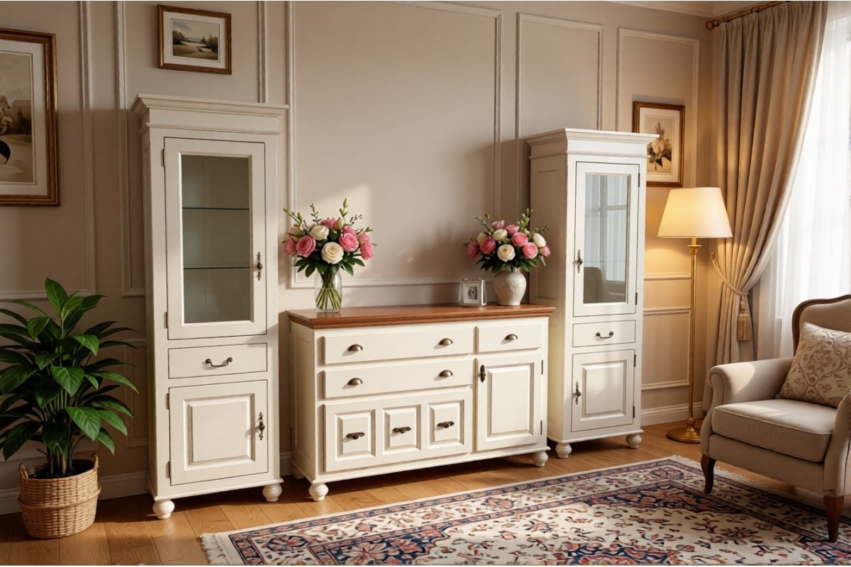 Наполнение: четыре выдвижных ящика и закрытое отделение с полкой.