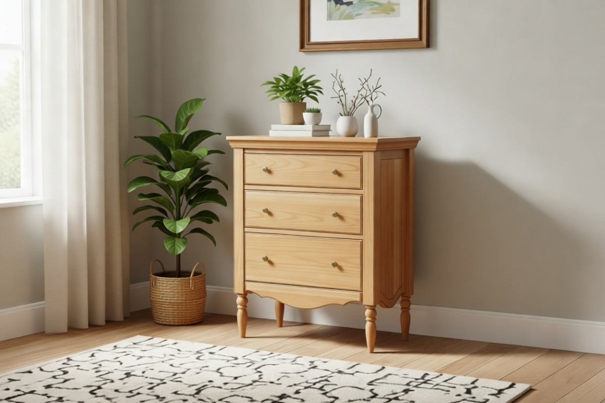 Материал изготовления: массив сосны. Дно у ящиков и задняя стенка: ДВП белого цвета.