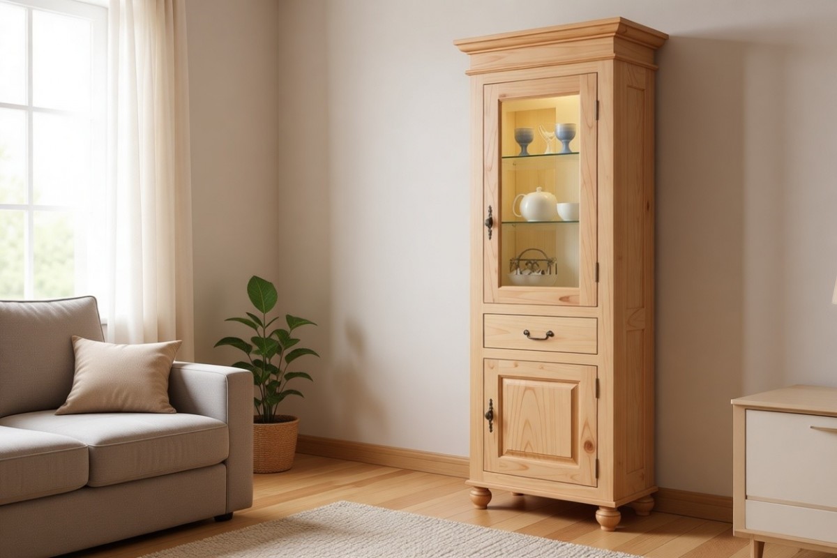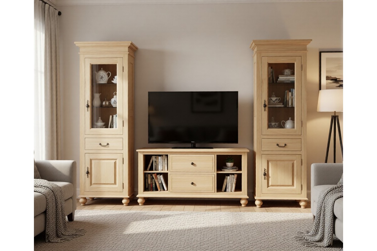 Наполнение: Открытая секция (за стеклянной дверцей) - две стеклянных полки и одна из массива. В нижней секции (за сплошной дверцей) одна полка из массива. Один выдвижной ящик. Стеклянные полки по желанию можно заменить на деревянные.
