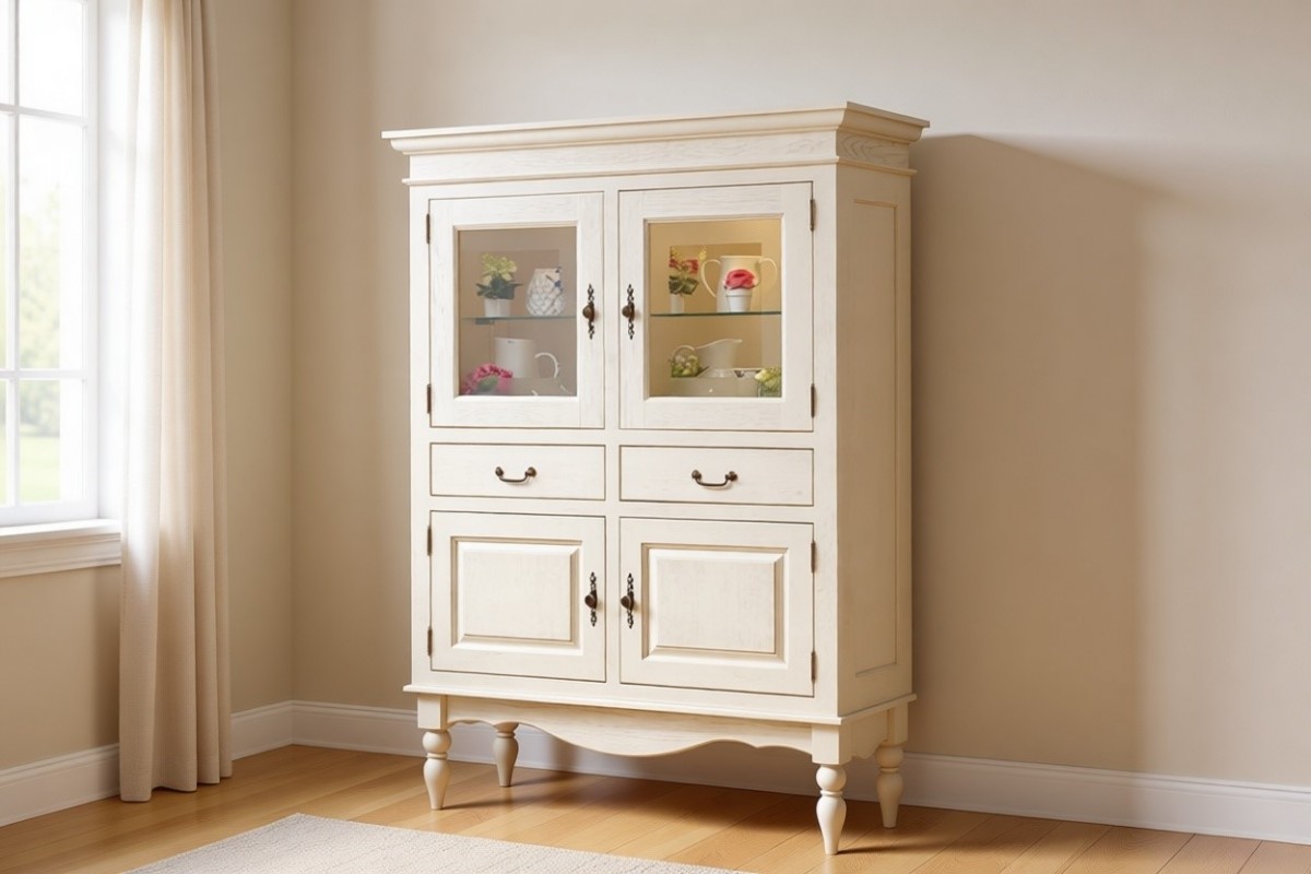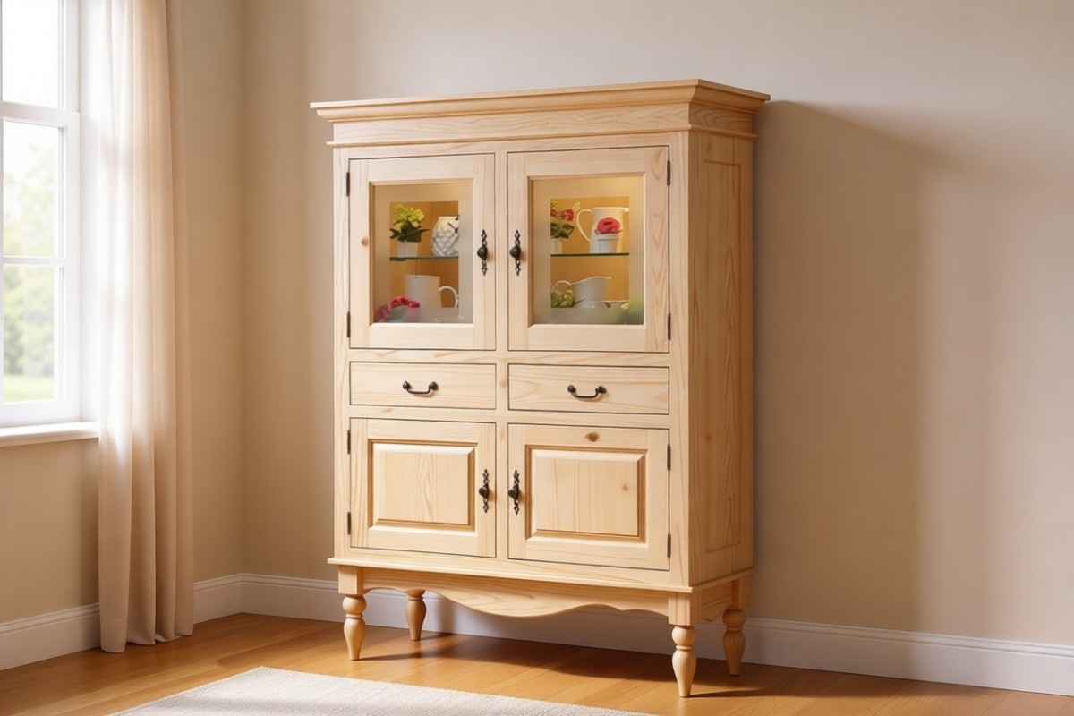 Наполнение: Открытая секция (за стеклянной дверцей) - одна стеклянная полка и одна из массива. В нижней секции (за сплошной дверцей) одна полка из массива. Два выдвижных ящика. Стеклянные полки по желанию можно заменить на деревянные.