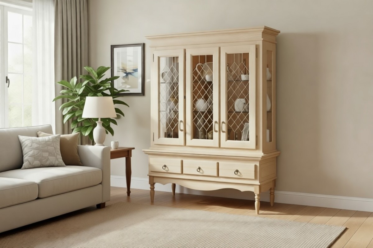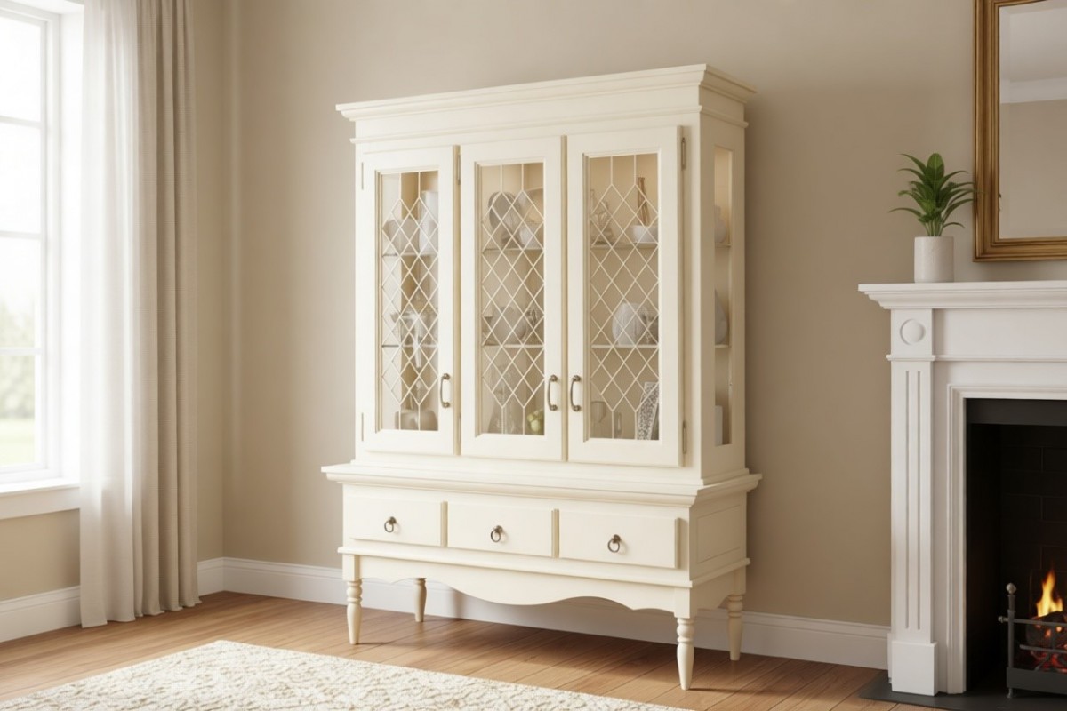Наполнение: Верхняя секция - три отделения со стеклянными полками. Нижняя секция - три выдвижных ящика. Полки переставные (три уровня высоты).