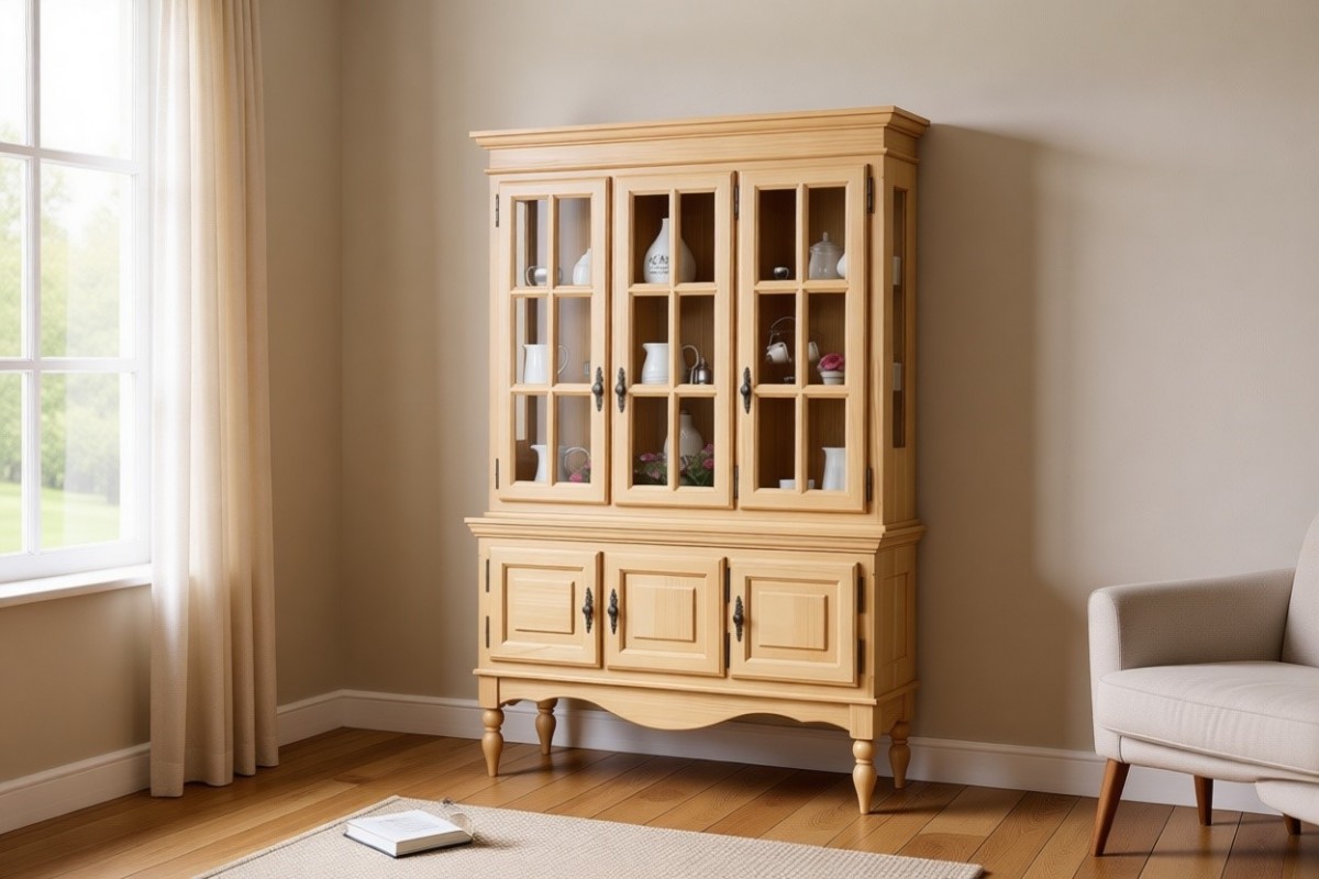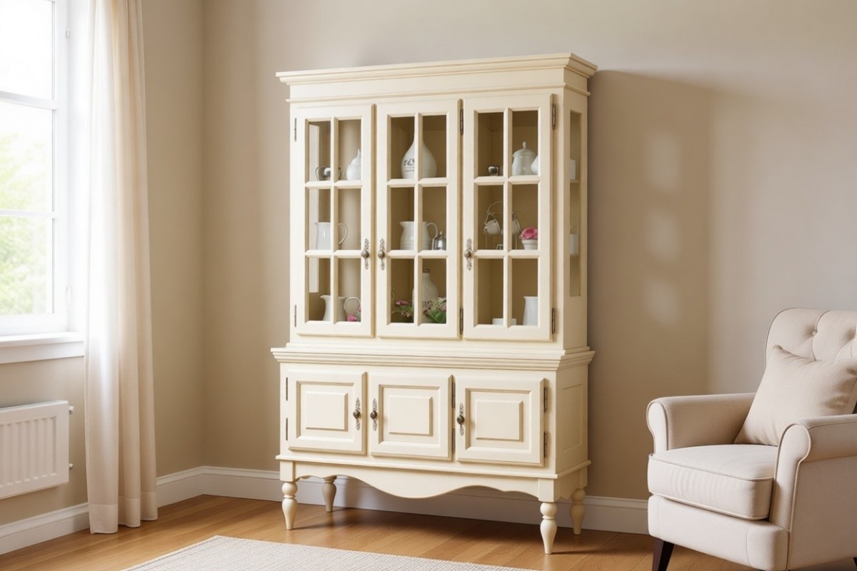 Наполнение: Верхняя секция - три отделения со стеклянными полками. Полки переставные - три уровня высоты. Нижняя секция - три закрытых отделения-ниши.