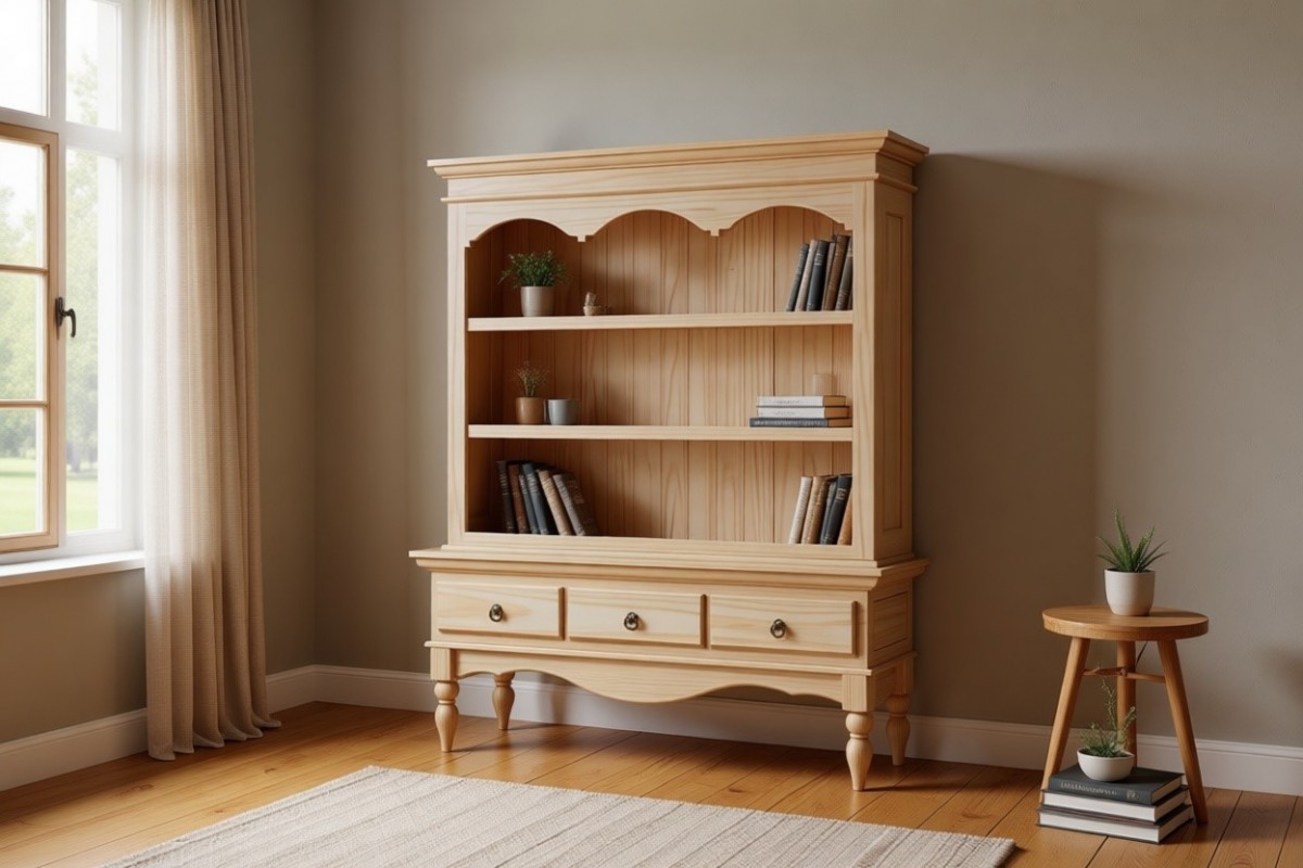 Материал изготовления: массив сосны. Дно у ящиков ДВП белого цвета. Задняя стенка - вагонка. Вставки на боковинах - фанера (берёза).