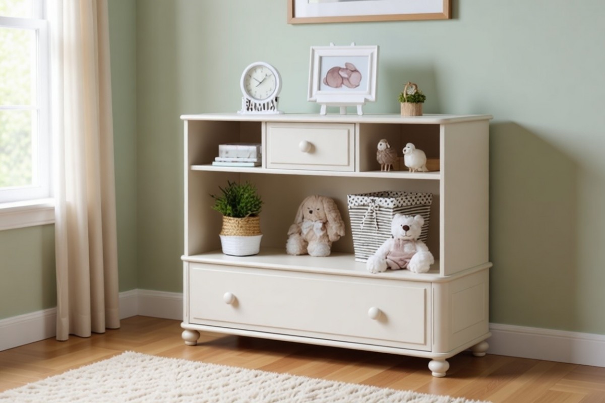 Материал изготовления: массив сосны. Дно у ящиков и задняя стенка - ДВП белого цвета Наполнение: два выдвижных ящика и три открытых ниши