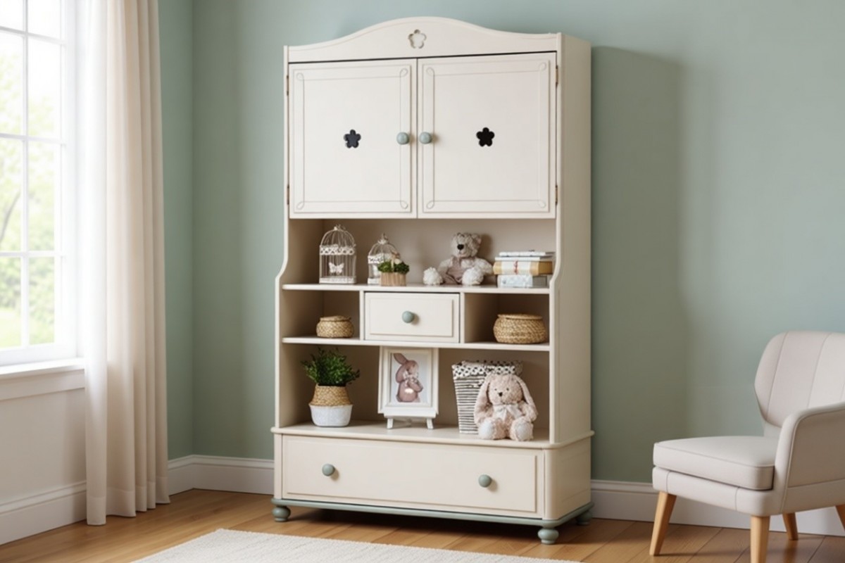 Материал изготовления: массив сосны. Дно у ящиков и задняя стенка - ДВП белого цвета. Наполнение: Два выдвижных ящика, открытые полки, в верхней части за дверьми - одна переставная полка - три уровня высоты.