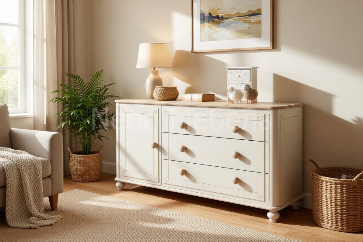 Материал изготовления: массив сосны. Дно у ящиков и задняя стенка - ДВП белого цвета.