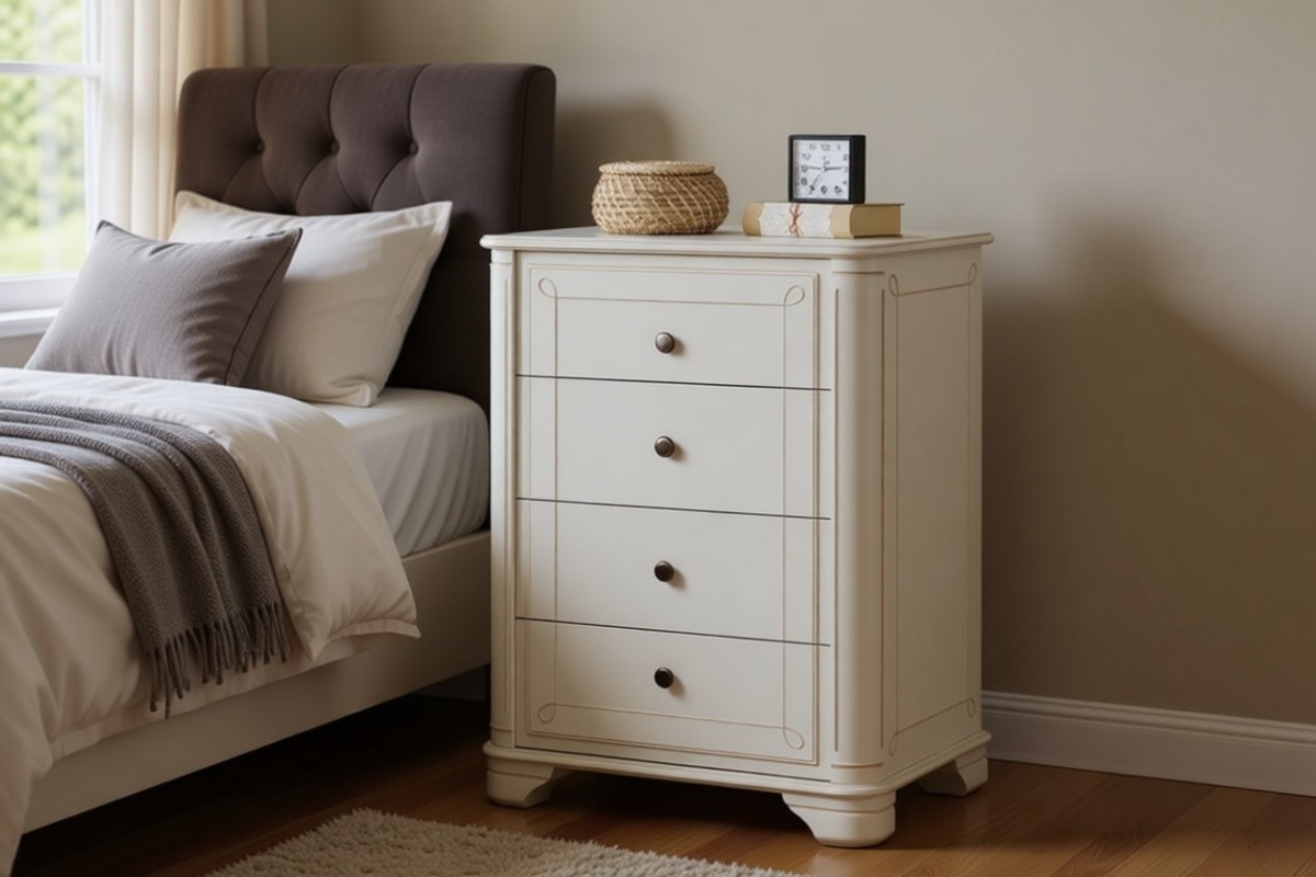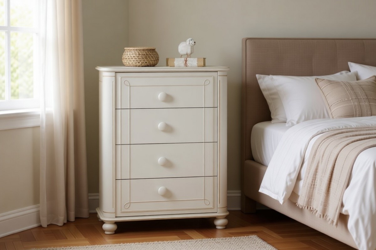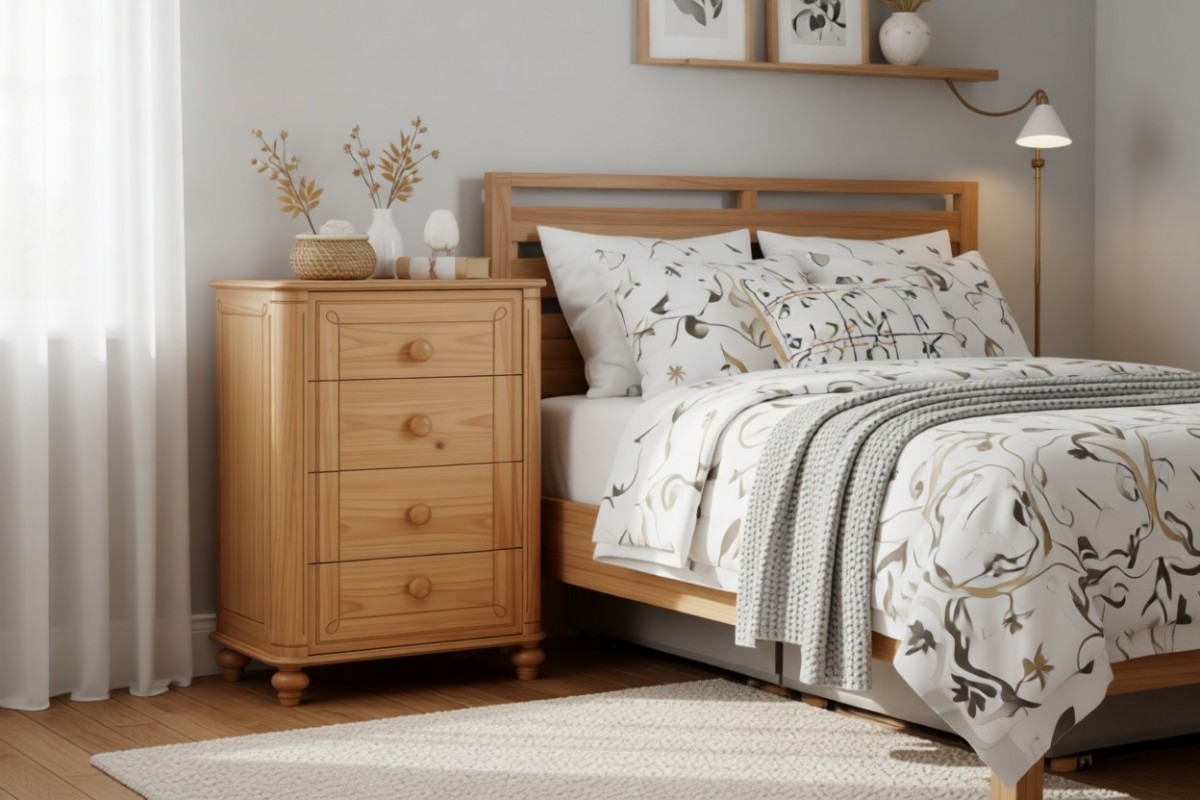 Материал изготовления: массив сосны. Дно у ящиков и задняя стенка - ДВП белого цвета.