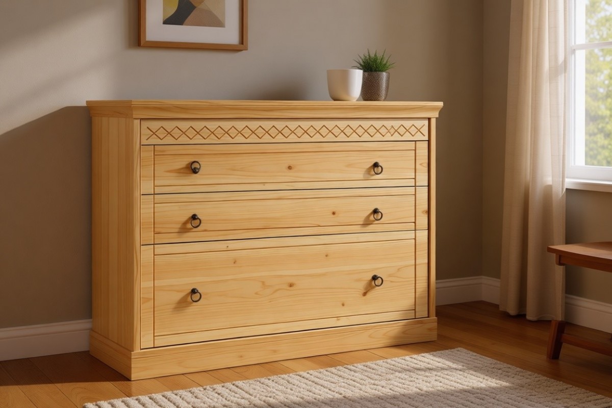 Материал изготовления: массив сосны. Дно у ящиков и задняя стенка: ДВП белого цвета.