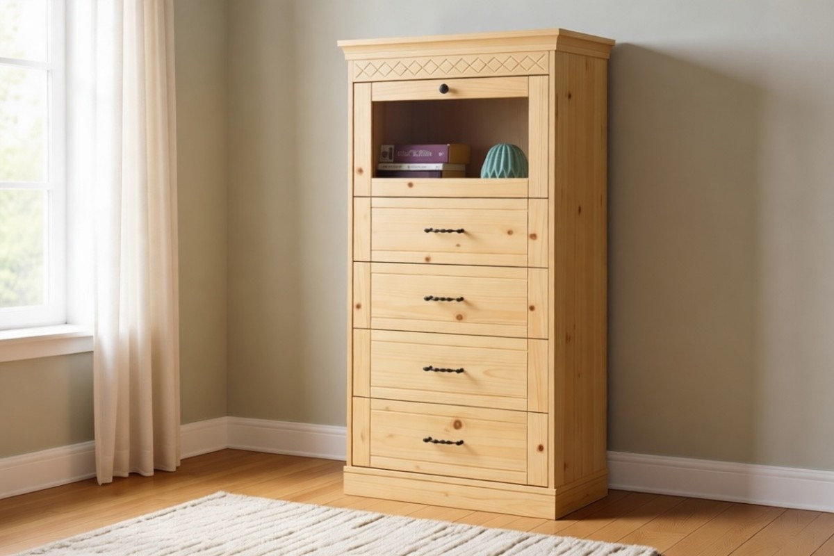 Материал изготовления: массив сосны. Задняя стенка и дно у ящиков: ДВП белого цвета (по желанию можно укомплектовать задней стенкой в цвет изделия).