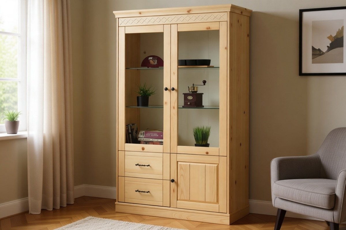 Наполнение: Открытая секция (за стеклянной дверцей) - две стеклянных полки. В нижней секции (за сплошной дверью) одна деревянная полка и два выдвижных ящика. Полки переставные - три уровня высоты.
