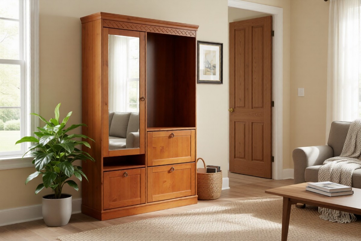 Наполнение: за дверью отделение с крючками, открытая ниша - штанга (от фасада к задней стенке), три отделения с механизмами для обувниц