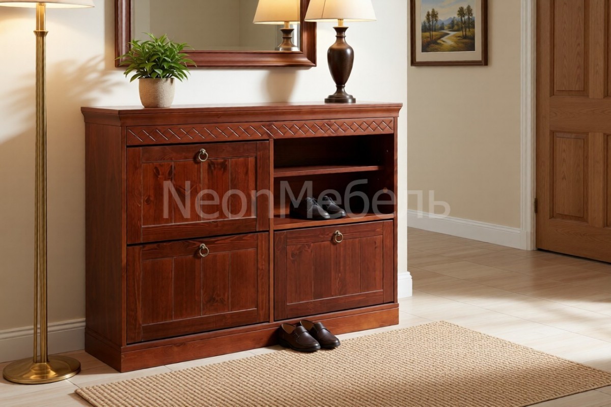 Комбинированная тумба для обуви Дания №3 изготавливается из дерева - массива карельской сосны. Тумба многофункциональна и не занимает много места в прихожей, но в то же время вместительна для большого колличества пар обуви.