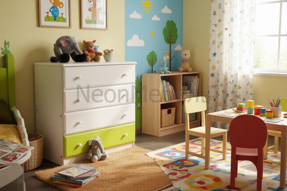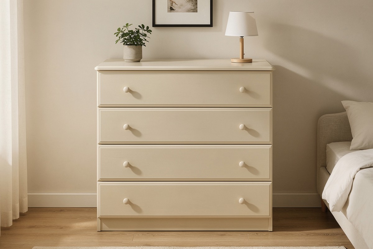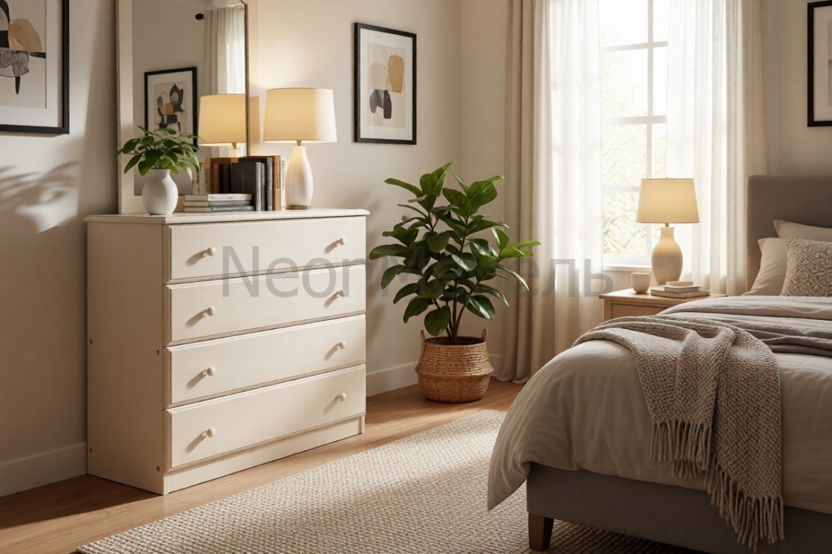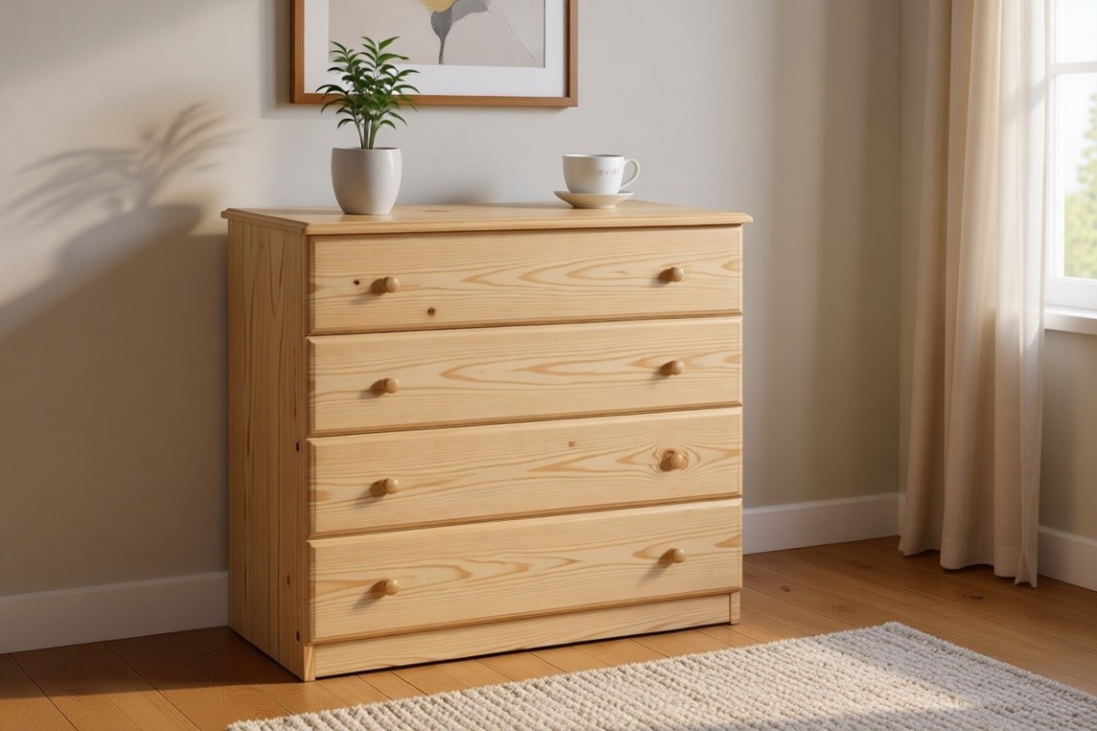 Материал изготовления: массив сосны. Дно у ящиков и задняя стенка: ДВП белого цвета. Наполнение: четыре выдвижных ящика.