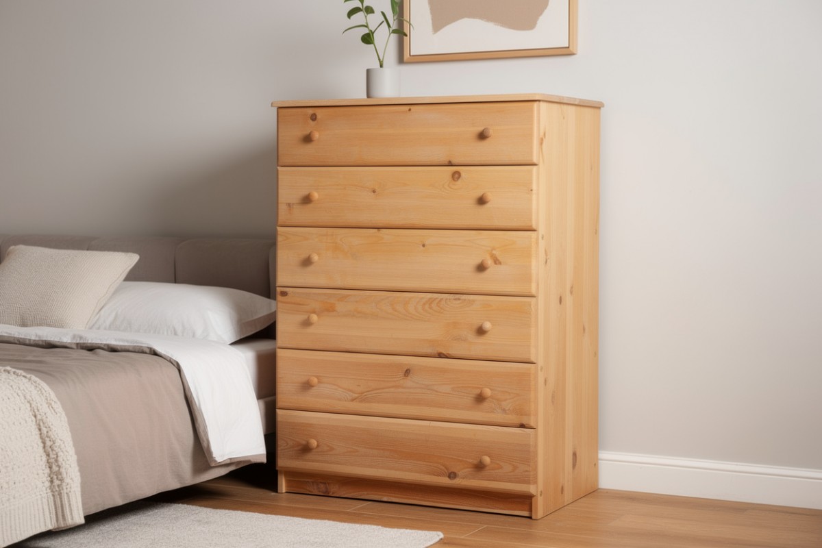 Материал изготовления: массив сосны. Дно у ящиков и задняя стенка: ДВП белого цвета. Наполнение: шесть выдвижных ящиков.