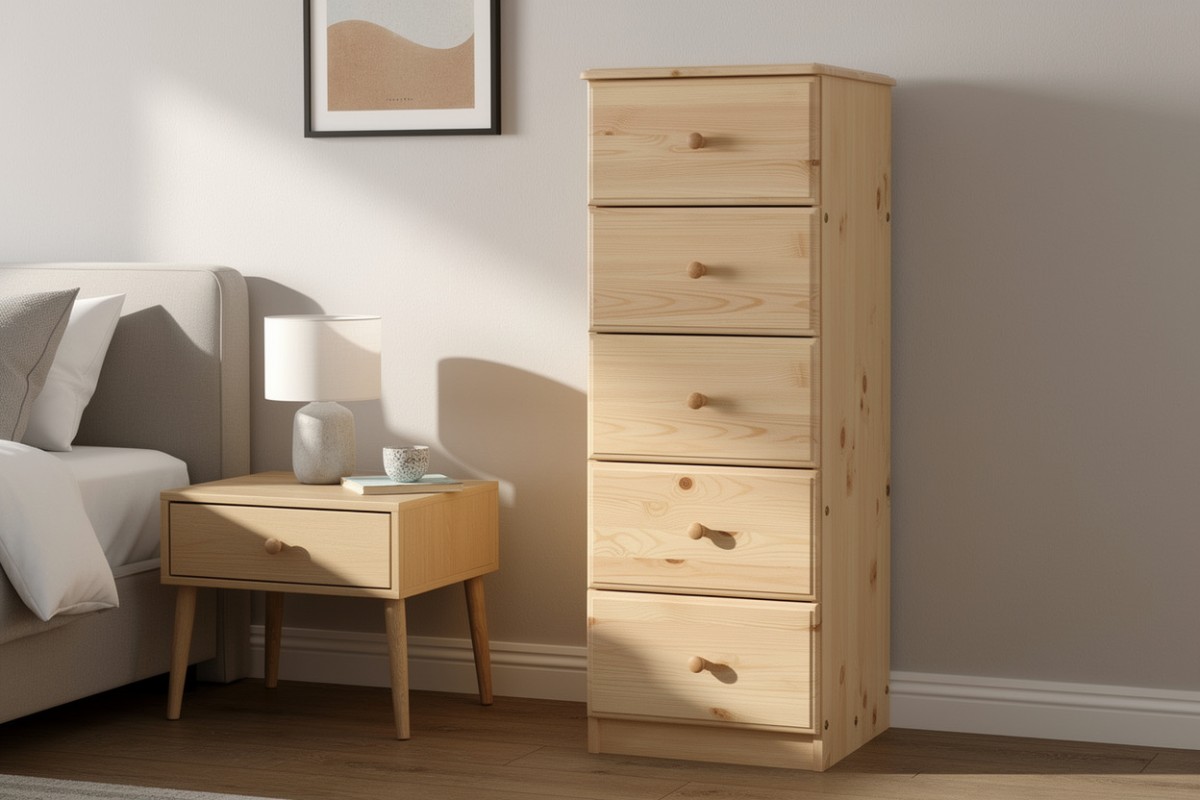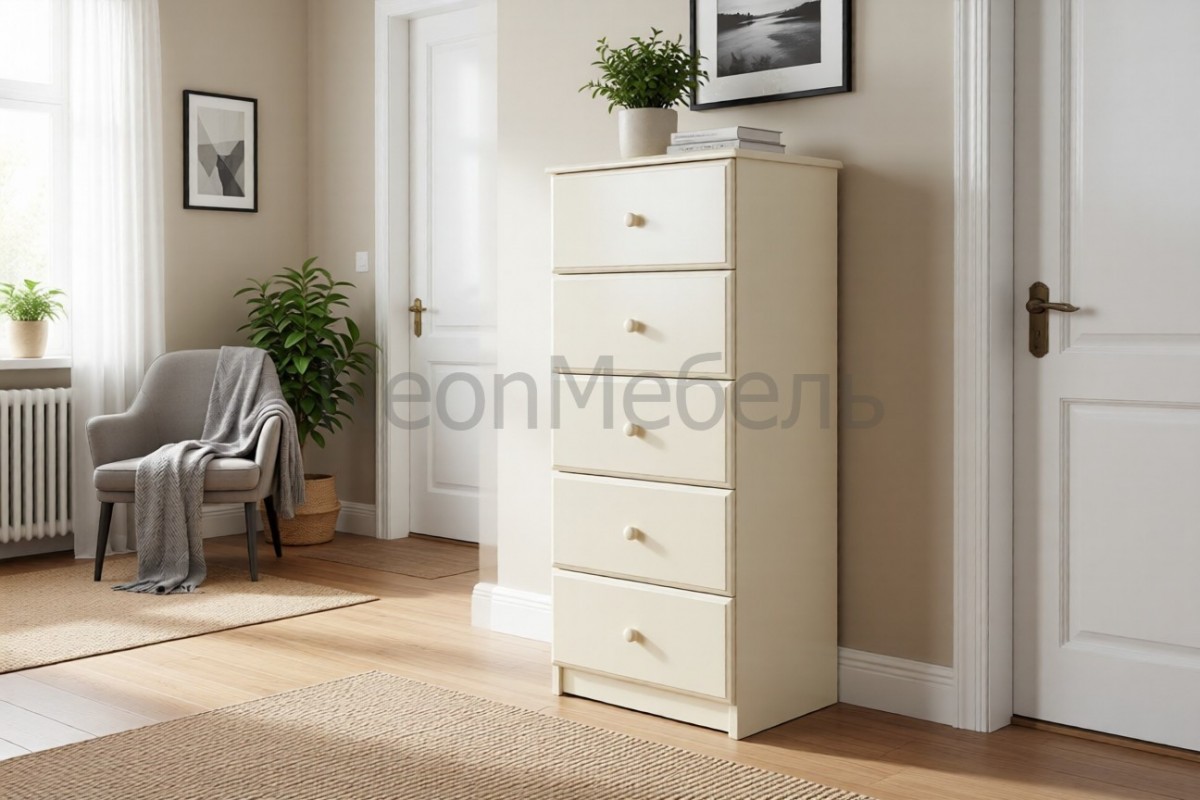 Материал изготовления: массив сосны. Дно у ящиков и задняя стенка: ДВП белого цвета. Наполнение: пять выдвижных ящиков.