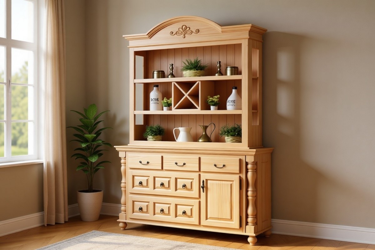 Материал изготовления: массив сосны. Задняя стенка в нижней секции и дно у ящиков: ДВП белого цвета (по желанию можно укомплектовать задней стенкой в цвет изделия). Вставки на боковинах: фанера (берёза). Задняя стенка в верхней секции: вагонка