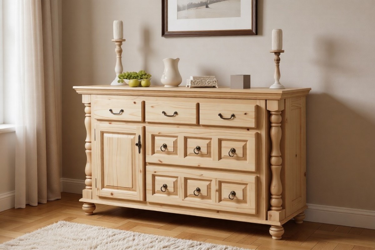 Материал изготовления: массив сосны. Дно у ящиков и задняя стенка: ДВП белого цвета.