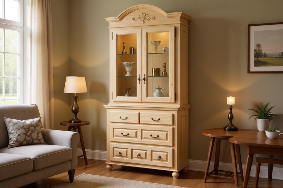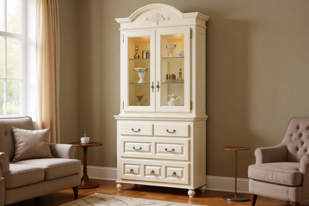 Наполнение: Верхняя секция (за стеклянной дверцей) - две стеклянных полки. Полки переставные - три уровня высоты. Нижняя секция в виде комода с четырьмя выдвижными ящиками. Стеклянные полки по желанию можно заменить на деревянные.