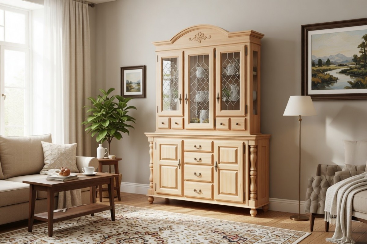 Материал изготовления: массив сосны. Задняя стенка и дно у ящиков: ДВП белого цвета (по желанию можно укомплектовать задней стенкой в цвет изделия). Вставки на боковинах: фанера (берёза)