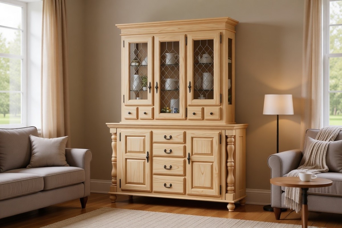 Материал изготовления: массив сосны. Задняя стенка и дно у ящиков: ДВП белого цвета (по желанию можно укомплектовать задней стенкой в цвет изделия). Вставки на боковинах: фанера (берёза)
