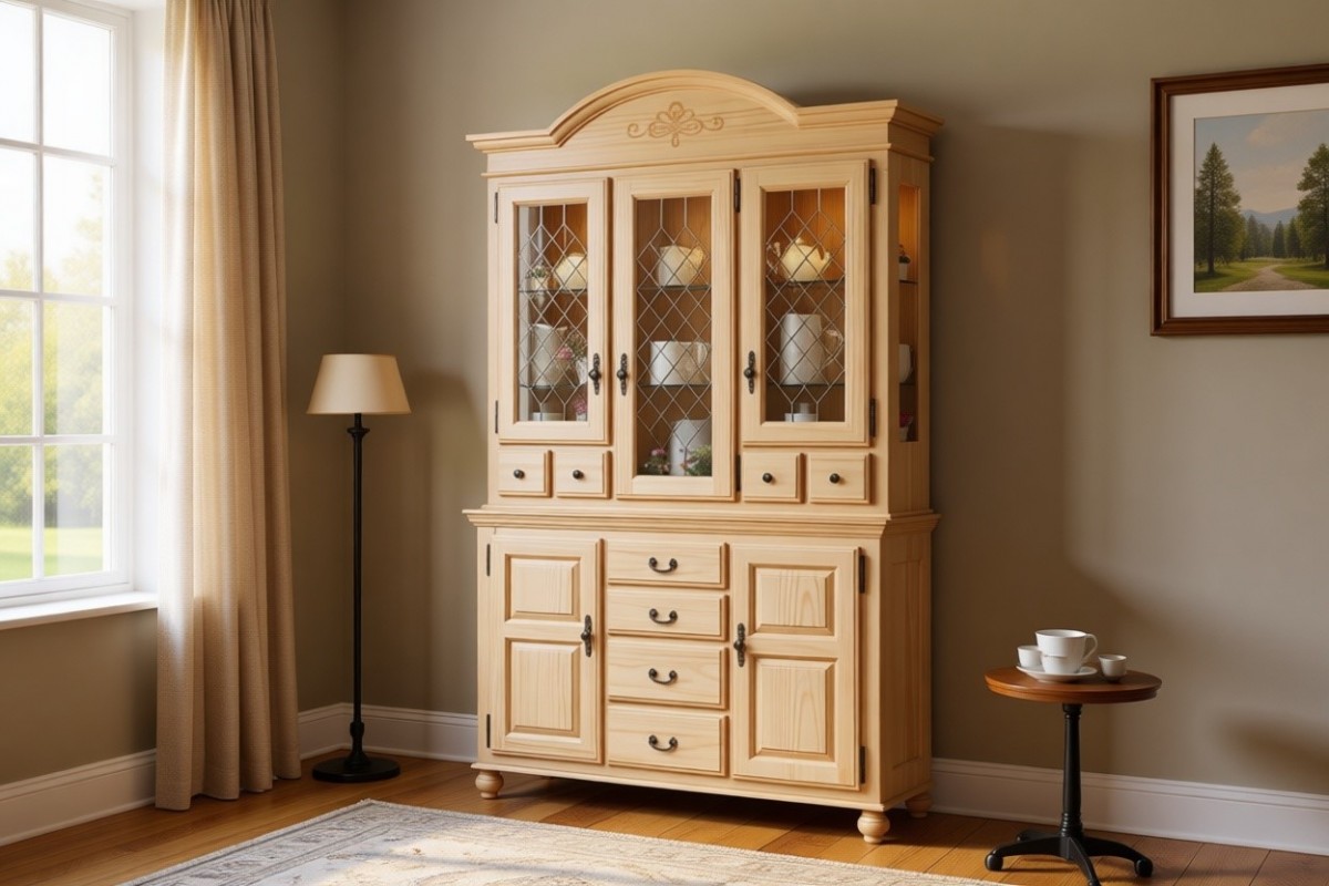 Материал изготовления: массив сосны. Задняя стенка и дно у ящиков: ДВП белого цвета (по желанию можно укомплектовать задней стенкой в цвет изделия). Вставки на боковинах: фанера (берёза)