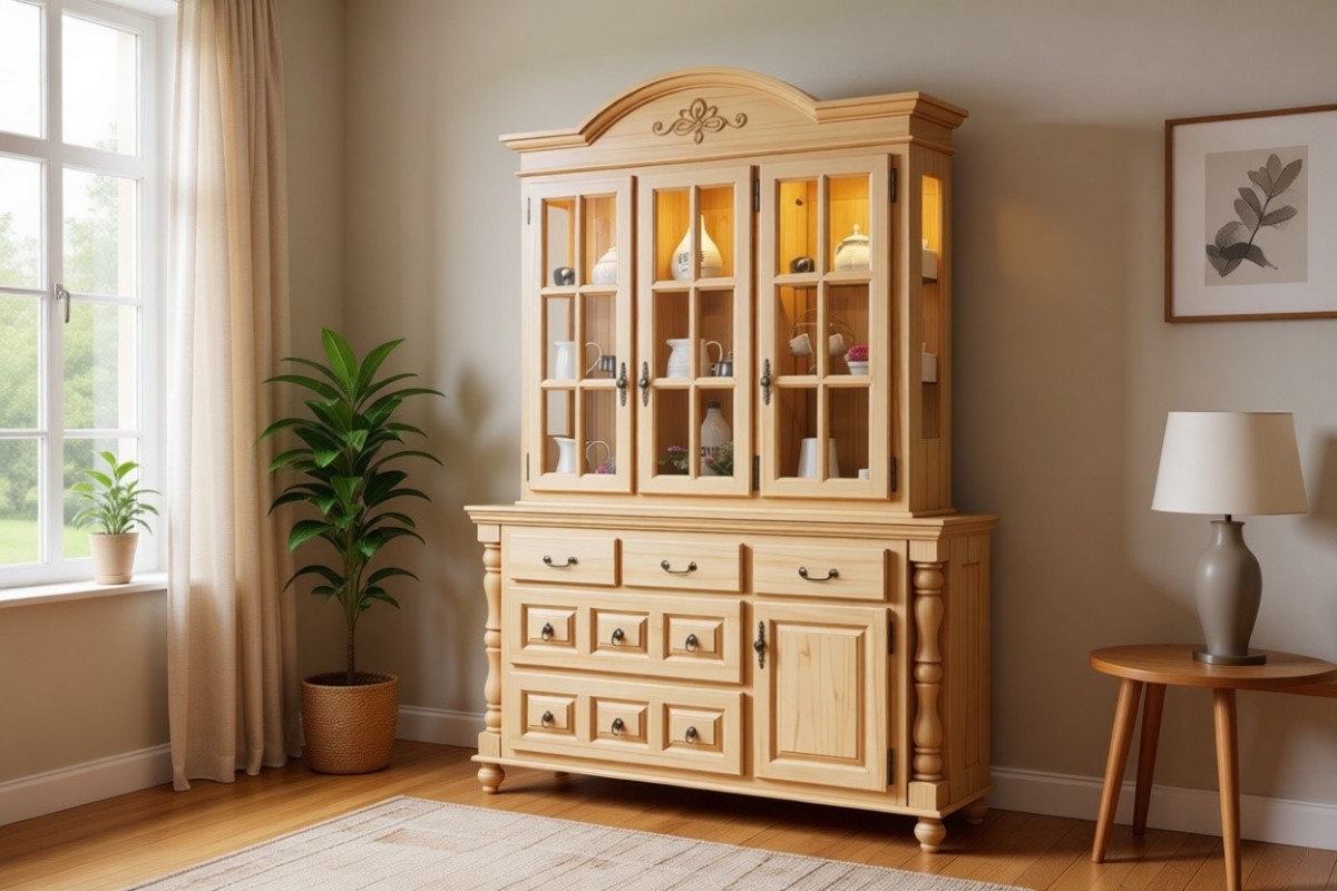 Материал изготовления: массив сосны. Задняя стенка и дно у ящиков: ДВП белого цвета (по желанию можно укомплектовать задней стенкой в цвет изделия). Вставки на боковинах: фанера (берёза)